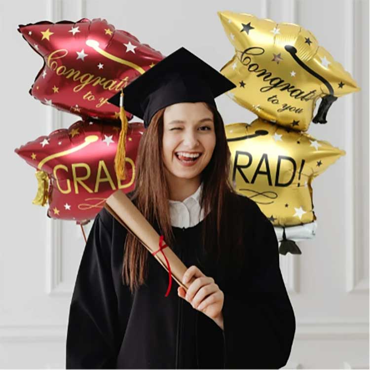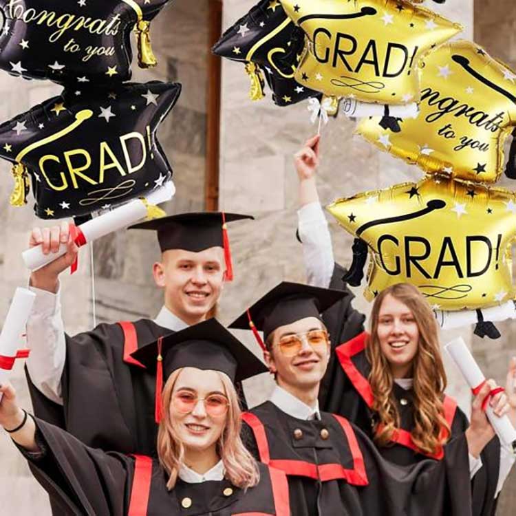 Set Belon Cap Pengijazahan 32 Inci kami diperbuat daripada filem PET aluminized berkualiti tinggi setebal 18 mikron. Filem ini mempunyai keanjalan yang sangat baik, mengembang sepenuhnya dan gebu serta tahan terhadap mampatan dan hentaman—sesuai untuk sekolah dan tempat yang serupa. Kami menggunakan dakwat mesra alam untuk mencetak, menghasilkan warna yang terang, sekata yang tahan luntur. Walaupun selepas berjam-jam terdedah kepada cahaya matahari langsung, seperti pada majlis graduasi di luar, corak dan warna kekal bersemangat seperti biasa.