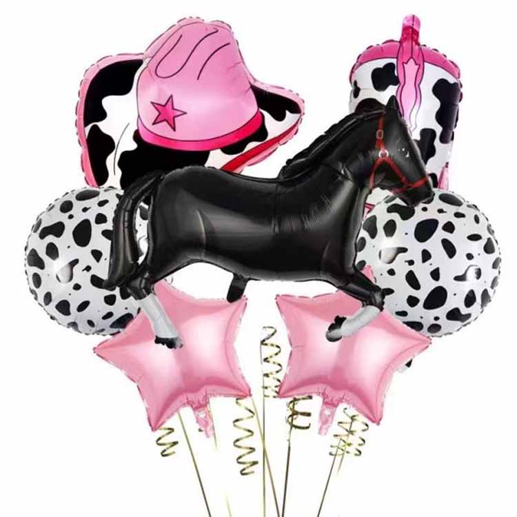 Dengan kontur garis yang tepat dan padanan warna, mereka memulihkan kontur otot dan mengalir kuda kuda yang berjalan, dan skema warna semula jadi yang sama seperti coklat dan hitam lebih baik sepadan dengan imej sebenar kuda. Sesetengah belon foil bertema koboi walaupun menambah warna logam seperti perak dan emas untuk meningkatkan kesan visual; Corak lembu adalah bulat, dengan corak lembu hitam dan putih dicetak di atasnya, dan beberapa gaya menambah beberapa hiasan tiga dimensi seperti loceng kecil dan PLUSH Tails di bawah belon foil aluminium, yang kedua -duanya comel dan mempunyai gaya luar bandar, dan merupakan tema yang sangat popular untuk aktiviti koboi untuk keluarga.