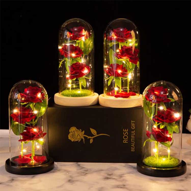 Di dalam kubah kaca mawar adalah tiga bunga yang dipelihara diletakkan pada ketinggian yang berbeza, dengan batang realistik dan daun hijau. Penutup kaca tahan panas dan tidak mudah rosak. kad hadiah yang disesuaikan.